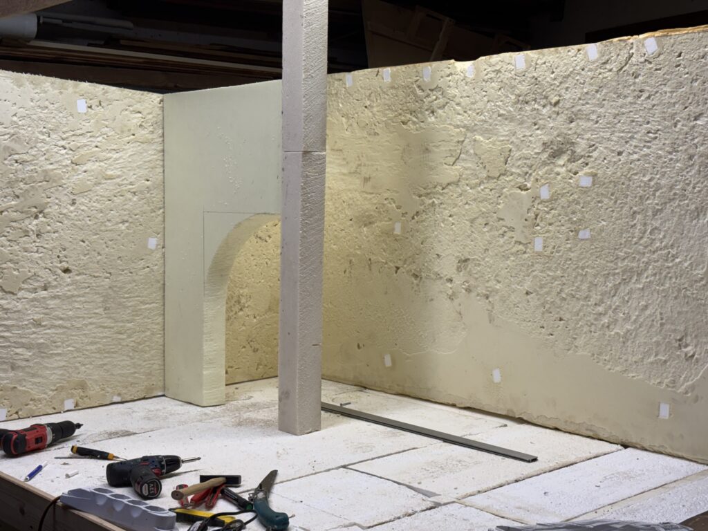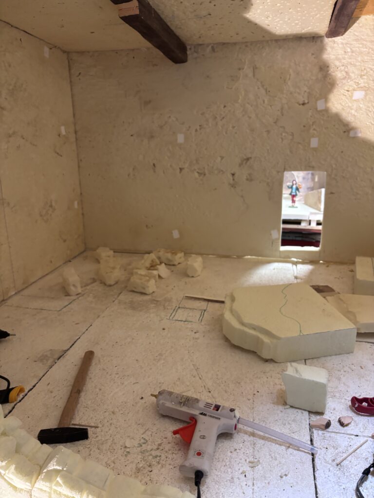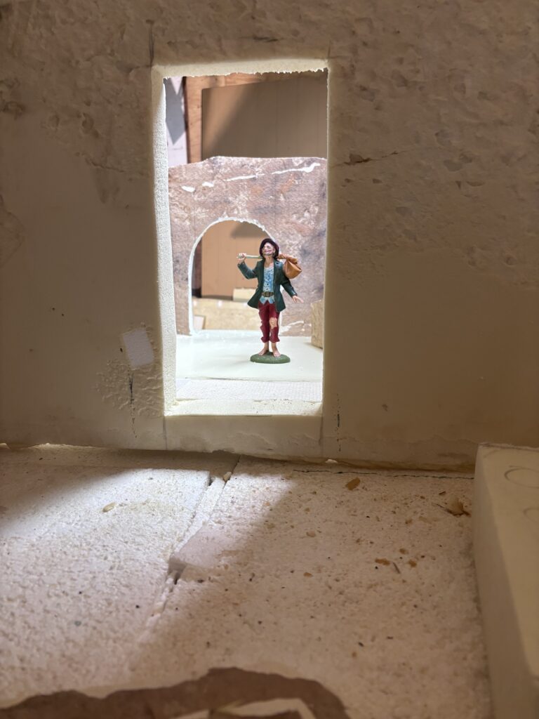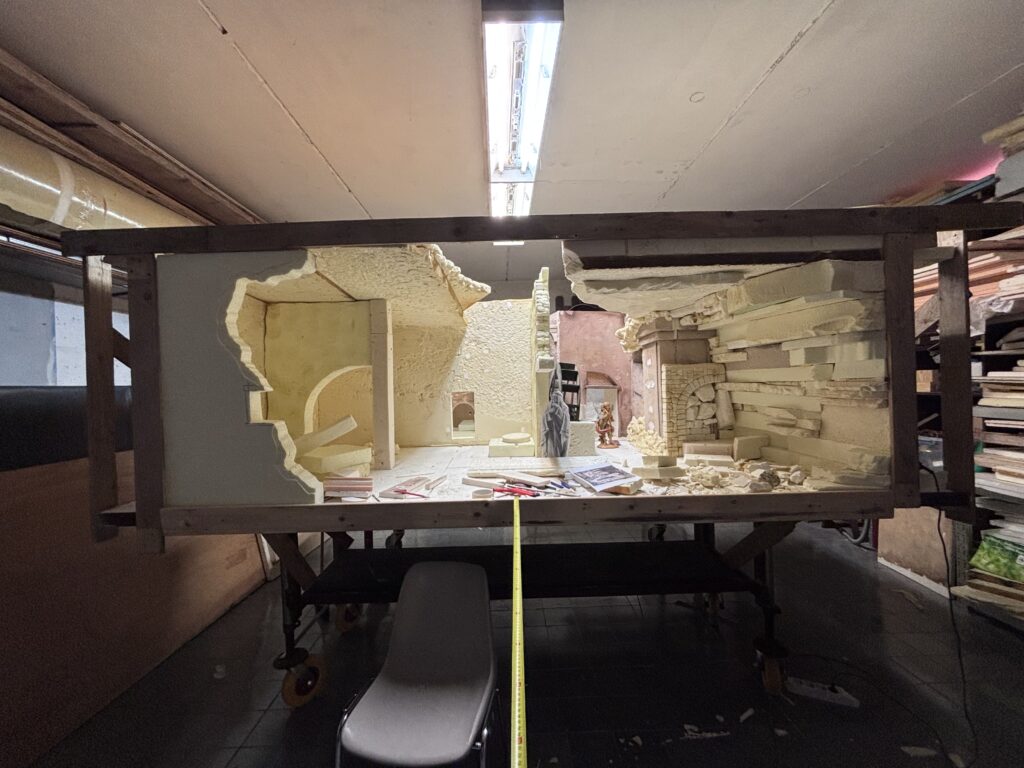 L’ossatura del paesaggio è realizzata in polistirene, intagliato pazientemente a mano per dare forma alle case e alle rocce del borgo. Per ottenere l’effetto realistico delle pareti rocciose, abbiamo utilizzato stampi in sughero riempiti con poliuretano espanso, una tecnica che conferisce una texture naturale e antica.