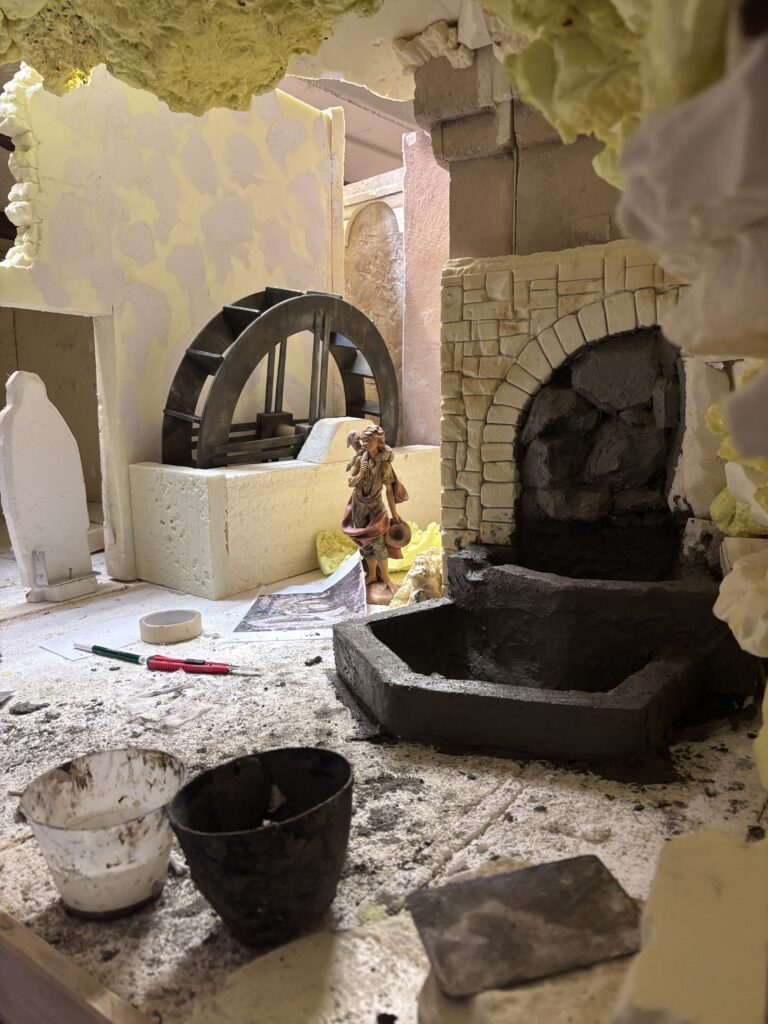 Il realismo si nasconde nei dettagli. Il vecchio mulino è stato costruito interamente in legno, lavorato per apparire usurato dal tempo. La fontana, elemento centrale, è un mix di polistirene e cemento, trattata con guaina liquida impermeabilizzante e dipinta con colori acrilici per integrarsi perfettamente nella roccia circostante.
